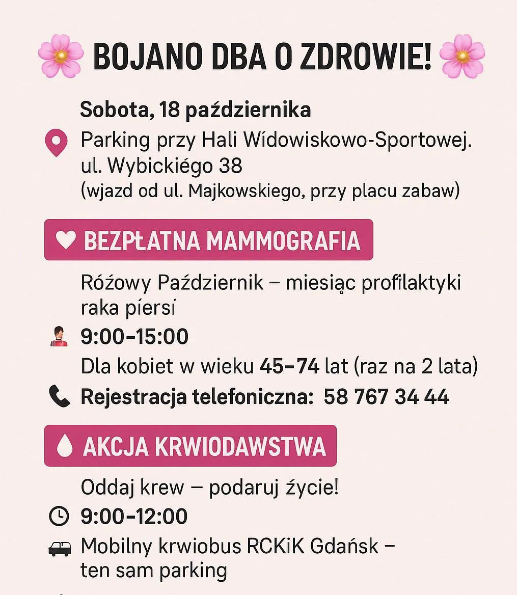Już w najbliższą sobotę, 18 października, mieszkańcy gminy będą mieć możliwość, by zadbać o własne zdrowie i jednocześnie pomóc innym. Przy Hali Widowiskowo-Sportowej w Bojanie odbędą się dwie ważne akcje prozdrowotne: bezpłatna mammografia oraz mobilna akcja krwiodawstwa.