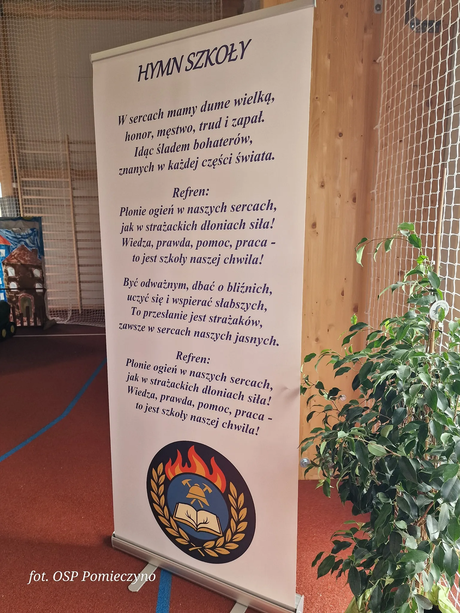 Uroczystość nadania imienia i przekazania sztandaru była momentem, w którym po raz pierwszy oficjalnie ośpiewano nowy hymn szkoły. Jego refren brzmi: „Płonie ogień w naszych sercach jak w strażackich dłoniach siła! Wiedza, prawda, pomoc, praca – to jest szkoły naszej chwila”.