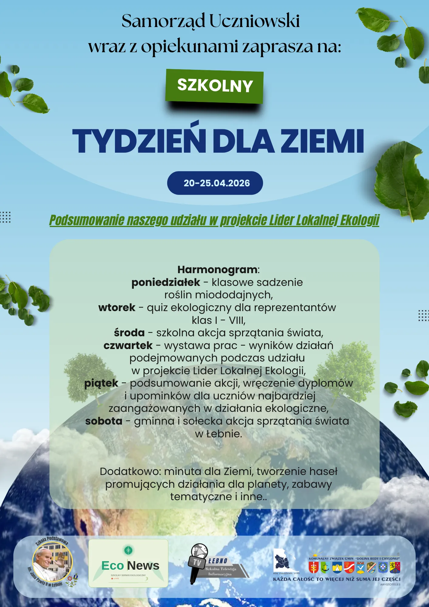 „Tydzień dla Ziemi” to nie tylko jednorazowa akcja, ale przede wszystkim podsumowanie udziału szkoły w projekcie „Lider Lokalnej Ekologii”. Konkurs ten jest organizowany przez Komunalny Związek Gmin „Dolina Redy i Chylonki” – instytucję, która sama posiada prestiżowy tytuł Lidera Polskiej Ekologii nadany przez Ministra Środowiska.