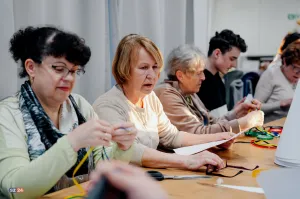Inauguracyjne zajęcia poświęcone były sztuce wykonywania czapki na diabelskie skrzypce. Uczestnicy mieli okazję zapoznać się z tradycyjnymi technikami zdobienia oraz bogatą symboliką tych charakterystycznych nakryć głowy. Podążając za instrukcjami, przeszli przez wszystkie etapy tworzenia czapki: od przygotowania wykroju, poprzez precyzyjne oklejenie skórą, aż po finalne doczepienie ozdobnej wstążki.