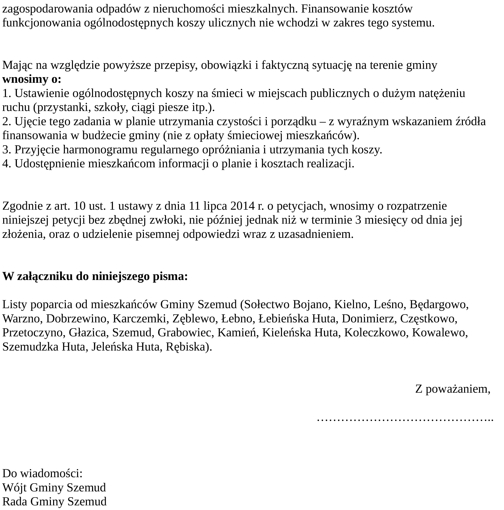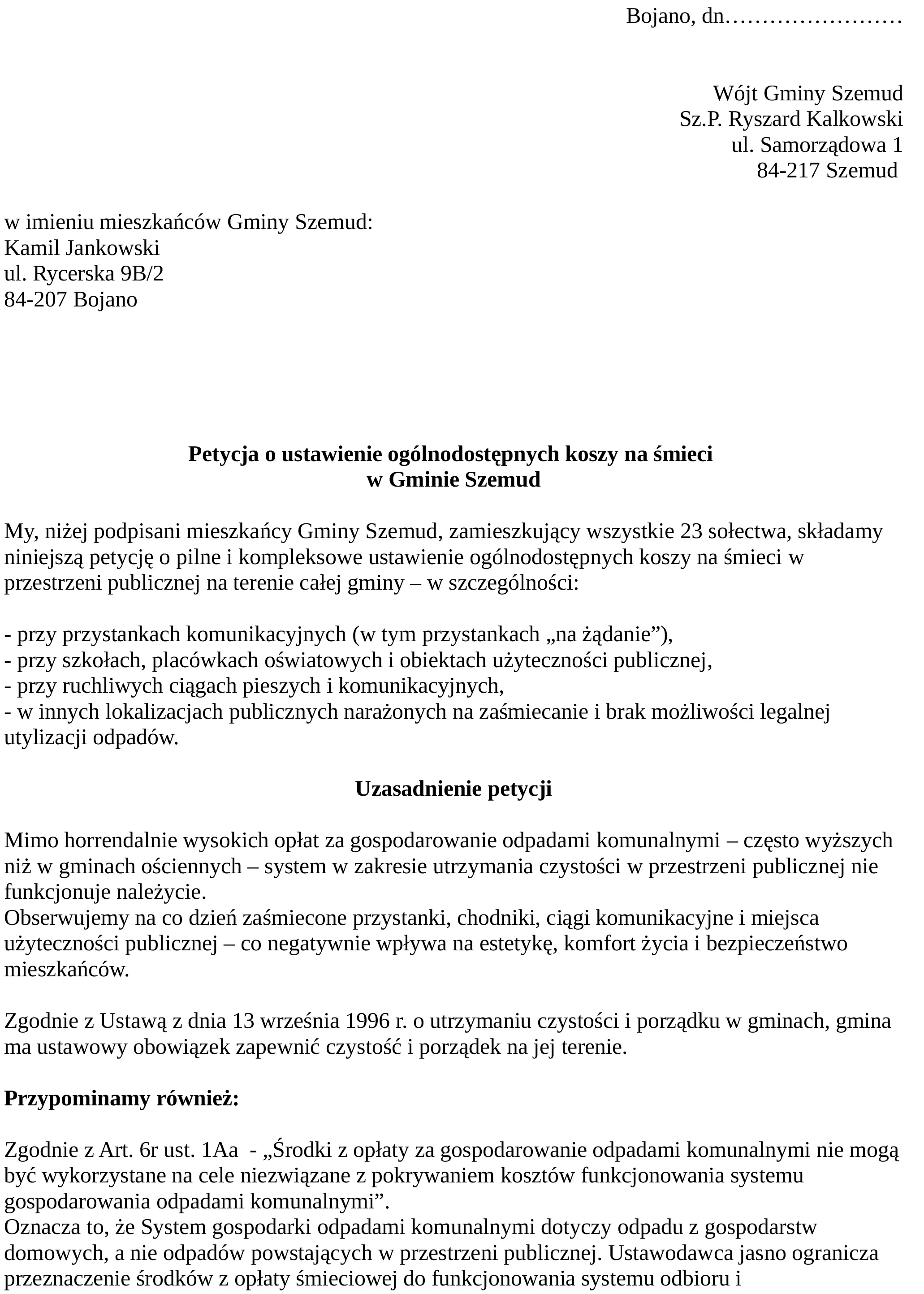 „Nie zgadzamy się na śmieci na przystankach i w rowach!” – pod takim hasłem rusza oddolna inicjatywa obywatelska w gminie Szemud. Mieszkańcy rozpoczynają zbiórkę podpisów pod petycją o ustawienie koszy na odpady w kluczowych miejscach publicznych. Lista punktów, w których można poprzeć akcję, stale rośnie. Na dole artykułu dostępna cała treść petycji.