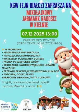 KGW Fejn Białczi zaprasza na Mikołajkowy Jarmark Radości, który odbędzie się na parkingu przy rondzie. Jarmark to nie tylko spotkanie z Magiczną Krainą Mikołaja, karuzelą i przejazdem bryczką, ale przede wszystkim bogata strefa pełna smaków i rękodzieła. Na stoiskach znajdziemy m.in. swojskie wędliny, domowe ciasta, przetwory z jagody kamczackiej, rękodzieło lokalnych twórców oraz pachnące świece sojowe. Dodatkową atrakcją będą warsztaty malowania bombek i słodki poczęstunek Elfów.