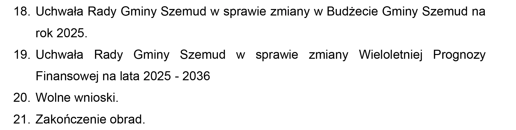 19 grudnia 2025 roku o godzinie 8:30 w Centrum Samorządowym w Szemudzie, ul. Samorządowa 1 odbędzie się uroczysta świąteczno - noworoczna XXI Sesja Rady Gminy Szemud. Będzie to też sesja budżetowa, na której zostanie przedstawiony projekt uchwały w sprawie przyjęcia budżetu gminy na rok 2026 oraz projekt uchwały w sprawie przyjęcia Wieloletniej Prognozy Finansowej na lata 2026 - 2036. Porządek obrad sesji zawiera 21 punktów. Obrady będą transmitowane online - pod tym linkiem.