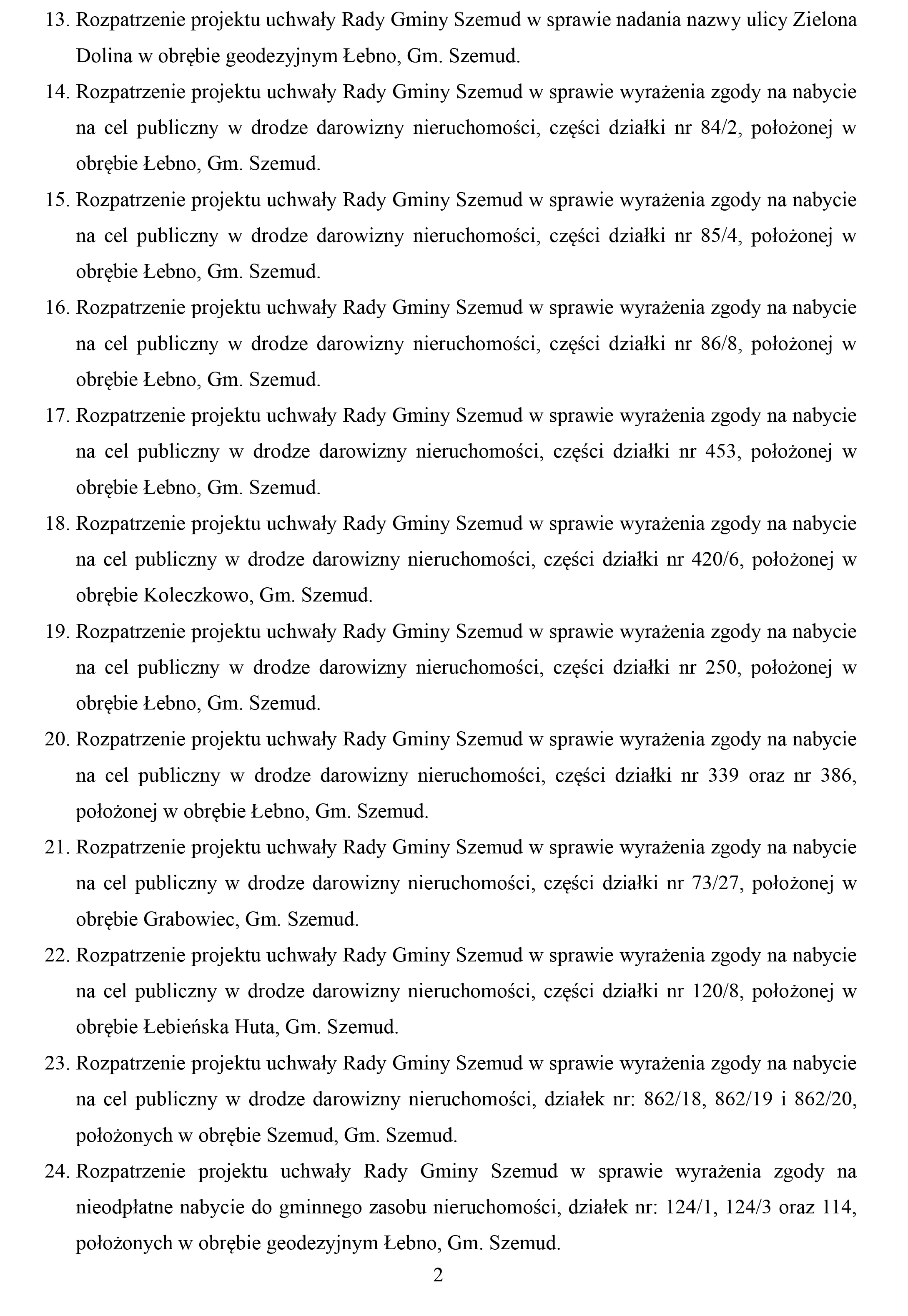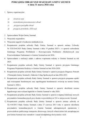 XXII Sesja Rady Gminy Szemud odbędzie się 31 marca 2026 roku o godzinie 8:00 w Centrum Samorządowym w Szemudzie, ul. Samorządowa 1. Porządek obrad sesji zawiera 38 punktów. Obrady będą transmitowane online - pod tym linkiem.
