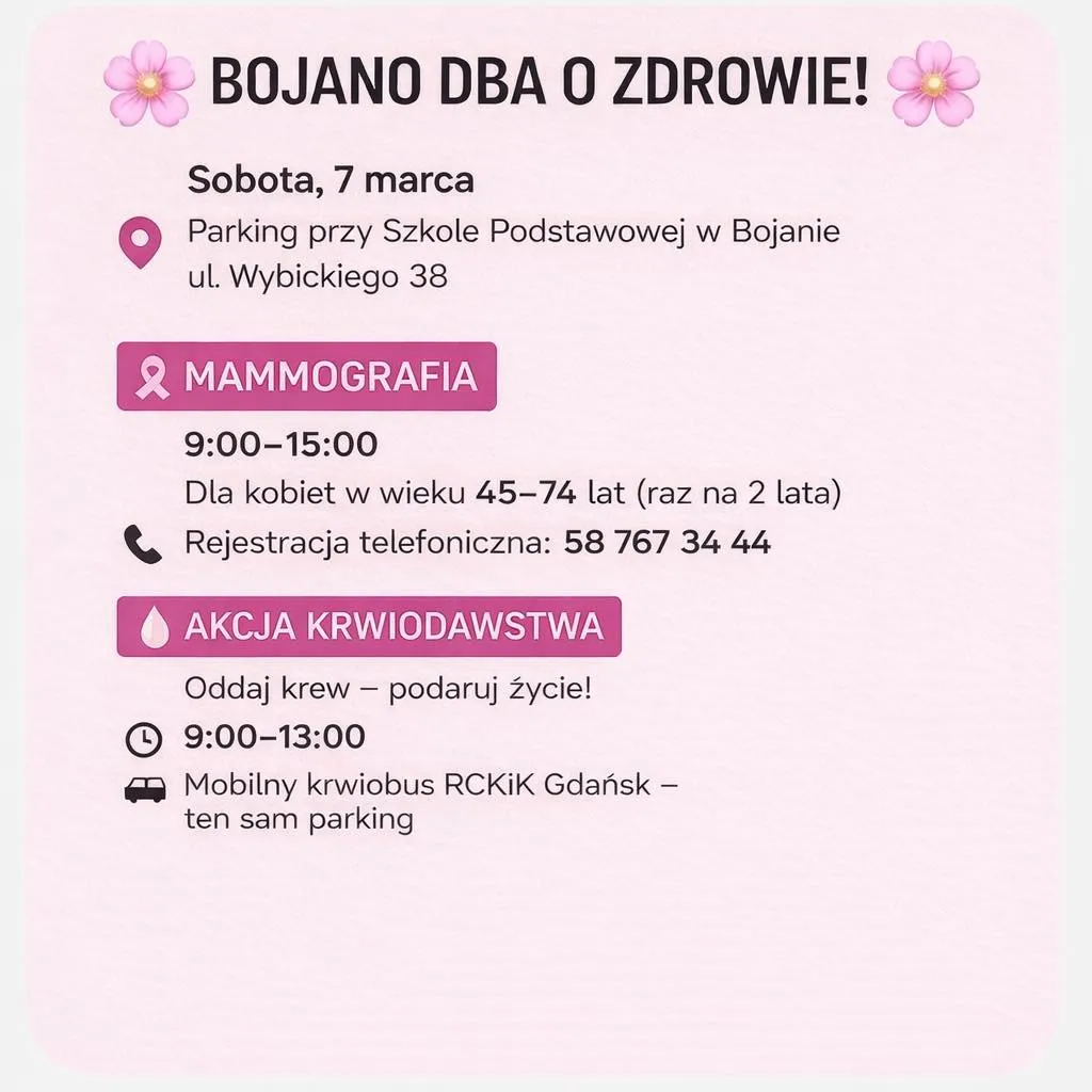 Już w sobotę, 7 marca w Bojanie będzie można skorzystać z bezpłatnych badań w profesjonalnym mammobusie. Na parkingu przy Szkole Podstawowej w godzinach od 9:00 do 15:00 pojawią się specjalistyczne pojazdy: mammobus oraz mobilny punkt poboru krwi. To doskonała okazja, by w jednym miejscu i czasie zadbać o siebie oraz pomóc innym.