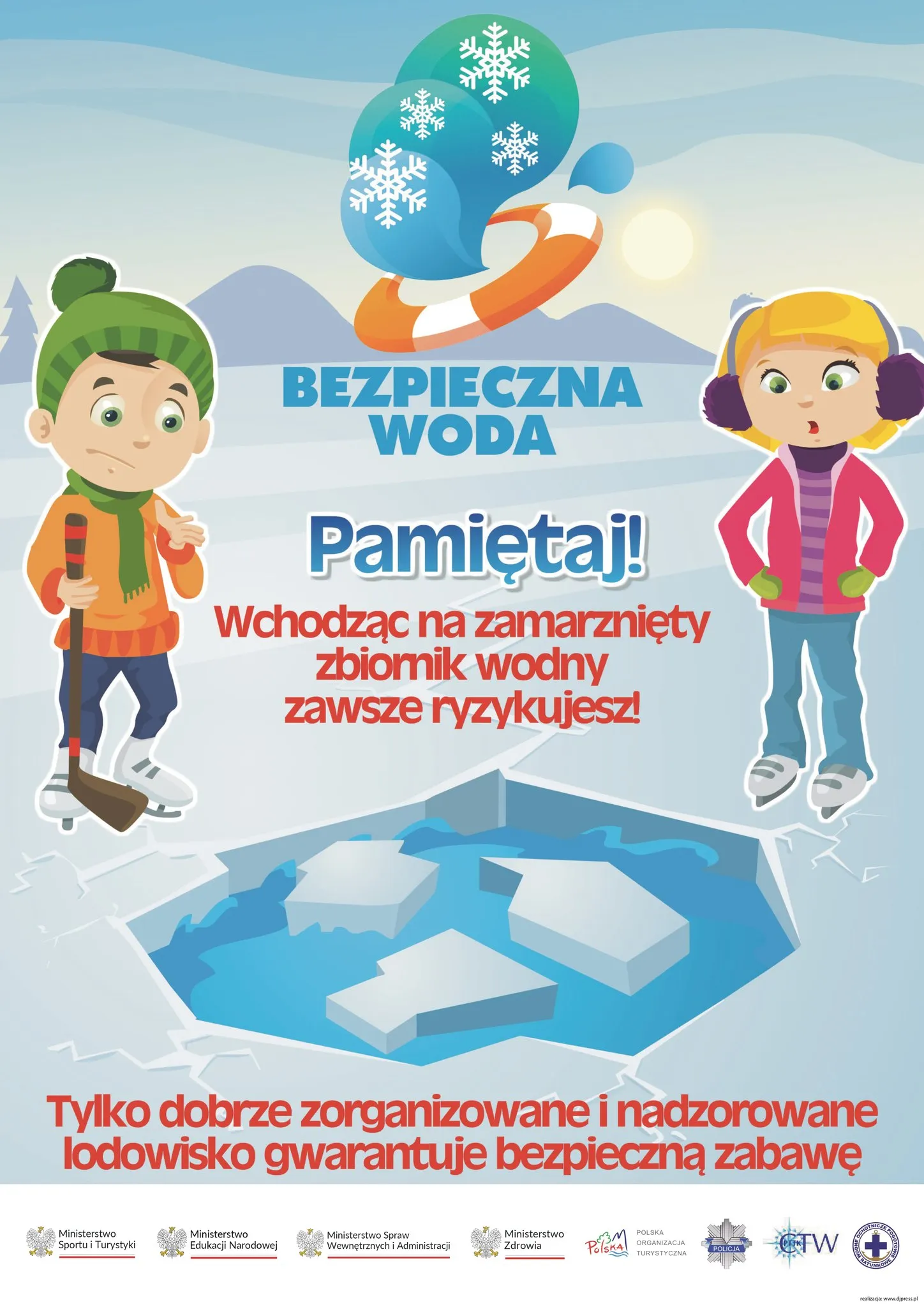 Wchodząc na zamarznięty zbiornik wodny, zawsze ryzykujesz. Należy pamiętać, że tylko profesjonalnie zorganizowane i nadzorowane lodowisko gwarantuje bezpieczną zabawę.